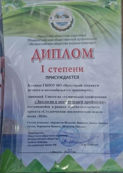 Команда ГБПОУ ИО ИрТРиАТ «Чистое будущее» — победитель на студенческой конференции «Экология в моей будущей профессии» в рамках городского молодёжного проекта «Студенческая экологическая неделя»!