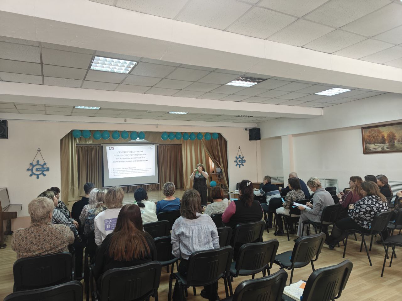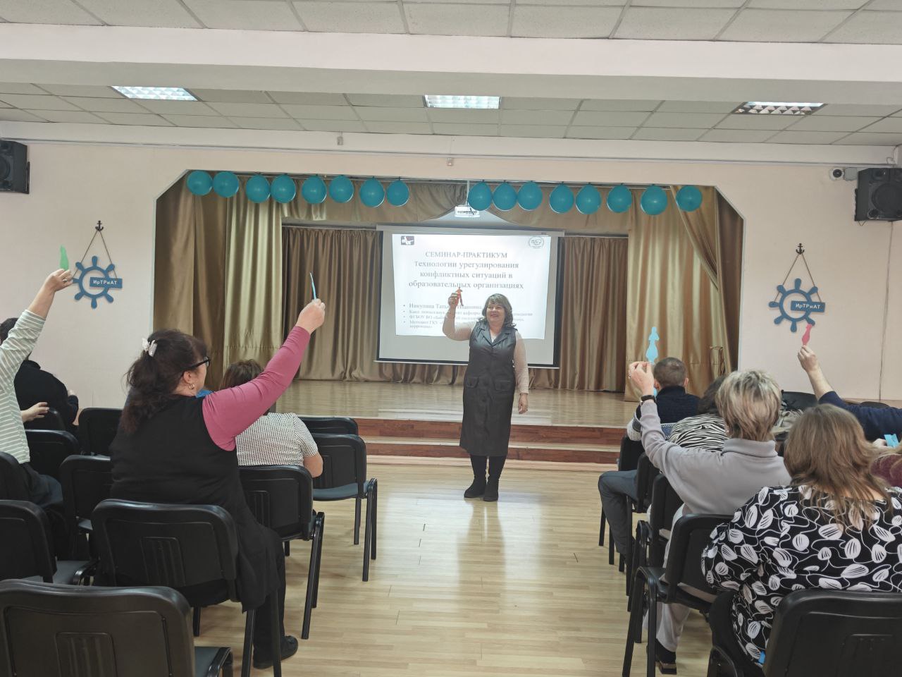 Мероприятие прошло в актовом зале и собрало преподавателей, заинтересованных в совершенствовании своих навыков работы с конфликтными ситуациями.